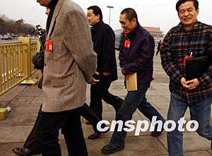 全國政協(xié)影視界的委員們掩護(hù)張藝謀將其掩護(hù)在中間,三月十三日快步走過天安門廣場,去參加全國政協(xié)的選舉大會。作者:賈國榮