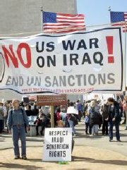 在主戰(zhàn)陣營(yíng)的領(lǐng)導(dǎo)者美國(guó)國(guó)內(nèi),來(lái)自100多個(gè)城市的數(shù)以萬(wàn)計(jì)示威者匯聚到首都華盛頓,以主辦者所形容的“人!睉(zhàn)術(shù),盡最后努力游說(shuō)布什總統(tǒng)聽聽民間反戰(zhàn)的聲音。示威者在華盛頓紀(jì)念碑集會(huì),其后匯合游行隊(duì)伍,聲勢(shì)浩大地游行往白宮和司法部。一名大學(xué)生呼吁:“布什總統(tǒng),聽聽今天在你面前人民的聲音吧,美國(guó)人說(shuō)“不要向伊拉克開戰(zhàn)””。