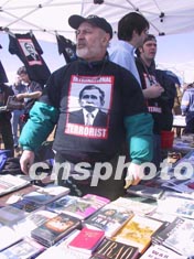 來自紐約“革命書店”的成員十五日在華盛頓紀(jì)念碑下向集會反戰(zhàn)的示威者兜售英文版的“毛主席語錄”小冊子。作者:中新社