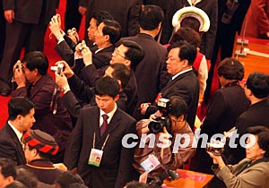 人大代表們?nèi)率巳赵诒本﹨⒓尤珖舜笫畬靡淮螘h的閉幕大會前,紛紛拍照留念。作者:賈國榮