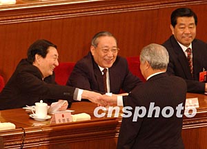 剛剛卸任總理的朱镕基,三月十八日在十屆人大一次會議閉幕式上,向當選副委員長的盛華仁握手祝賀。作者:賈國榮