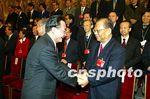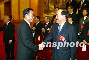 吳邦國委員長十八日下午在北京人民大會(huì)堂會(huì)見出席十屆人大一次會(huì)議的港澳代表。圖為吳邦國與香港代表曾憲梓握手。作者:毛建軍