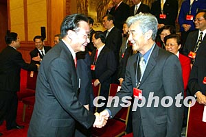 吳邦國委員長十八日下午在北京人民大會(huì)堂會(huì)見出席十屆人大一次會(huì)議的港澳代表,圖為吳邦國與澳門代表賀一誠握手。作者:毛建軍