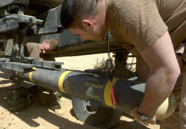 美101空降旅士兵為AH-64阿帕奇直升機安裝“地獄火”反坦克導(dǎo)彈