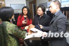 正在北京舉行的2003中國國際時(shí)裝周為中外企業(yè)洽談生意牽線搭橋。圖為中國企業(yè)家與意大利面料供應(yīng)商洽談生意。作者:史利