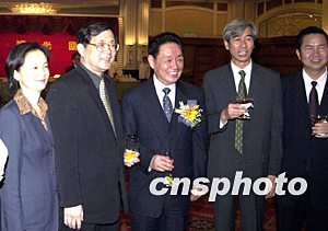 何厚鏵、原全國(guó)人大常委會(huì)副委員長(zhǎng)王漢斌、全國(guó)政協(xié)副主席馬萬祺及中央駐澳聯(lián)絡(luò)辦主任白志健在酒會(huì)為紀(jì)念《澳門基本法》頒布十周年電視特輯首播儀式揭幕。作者:李剛