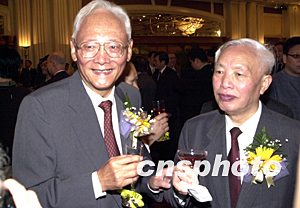 何厚鏵、王漢斌、馬萬祺、萬國(guó)權(quán)、魯平、郭東坡、白志健、萬永祥等在酒會(huì)上祝酒。作者:李剛