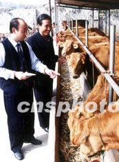 山東省棗莊市山亭區(qū)農(nóng)村信用社,大力扶持當(dāng)?shù)剞r(nóng)民發(fā)展畜牧養(yǎng)殖業(yè),使該區(qū)養(yǎng)殖專(zhuān)業(yè)戶(hù)達(dá)到四千六百多家。圖為信用社主任(左)向養(yǎng)牛專(zhuān)業(yè)戶(hù)了解牛的生長(zhǎng)情況。作者:李宗憲
