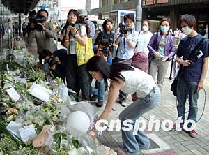 多圖:文華酒店外有不少?gòu)垏?guó)榮歌迷獻(xiàn)花致哀