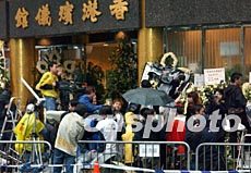 已故歌星張國榮設(shè)在香港殯儀館的靈堂于四月七日傍晚6時至8時開放,眾多記者冒雨匯集殯儀館采訪。錢興強 攝