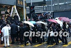 已故歌星張國榮設(shè)在香港殯儀館的靈堂于四月七日傍晚6時至8時開放,眾多歌迷冒雨前來致祭。錢興強 攝