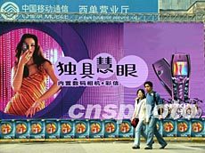 北京西單手機(jī)廣場(chǎng)四月新春豎起巨幅外國(guó)手機(jī)廣告。當(dāng)前市場(chǎng)競(jìng)爭(zhēng)激烈,中外廠商為廣告宣傳費(fèi)盡心機(jī)。作者:杜洋