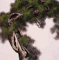 沈銀河的兩幅參展作品是以尖細(xì)的樹葉和濃烈的綠色表現(xiàn)出旺盛生命力的松樹水墨彩畫。閔庚燦表示,“沈銀河的畫力度感強,而且線條柔和。筆法非常出眾!