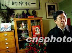 吳老的書房中,陳設(shè)一如以前。大部分家具是他和新鳳霞婚后買的,一用就用了五十多年。壁上除了照片,還掛著齊白石先生為新鳳霞題的兩句詩:“桐花萬里丹山路,雛鳳清于老鳳聲!眳抢咸蹛鄣男∝埐恢魅艘讶,溜進書房喵喵叫著。舒乙告訴記者,現(xiàn)代文學(xué)館計劃為吳老設(shè)立一個個人文庫,里面將陳列老人家的書籍和手稿。