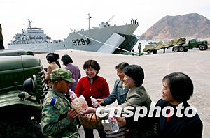 駐守在中國(guó)渤海深處一座小島上的數(shù)百名民眾,得知與他們朝夕相處的解放軍某導(dǎo)彈部隊(duì)官兵要外出執(zhí)行春季任務(wù)時(shí),紛紛送來(lái)海產(chǎn)品等到碼頭為官兵送行。作者:崔文斌