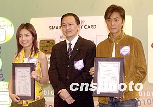 歌影紅星楊千嬅、鄭伊健4月17日在香港獲香港郵政委任為電子證書大使,協(xié)助推廣在新智能身份證加入電子證書,鼓勵市民廣泛使用。圖為香港郵政署長蔣任宏向楊千嬅、鄭伊健頒發(fā)委任狀。鄧慶樂 攝