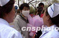 中新社北京四月十七日電(記者曾利明)北京佑安醫(yī)院今天舉行了一個(gè)特別的歡送會(huì),歡送又一位痊愈的非典型肺炎患者出院。醫(yī)院的院長(zhǎng)、書記、參加治療的醫(yī)生和護(hù)士代表一起把患者送出病區(qū)。站在醫(yī)院大門口的康復(fù)患者小石是為個(gè)二十歲的大學(xué)生。滿臉喜色的他,一邊接受兩位護(hù)士獻(xiàn)上的鮮花,一邊點(diǎn)頭向半個(gè)多月來(lái)為他精心治療、護(hù)理的大夫護(hù)士致謝:“謝謝你們!謝謝佑安醫(yī)院!”