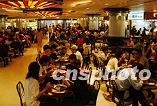 香港政府呼吁市民在作好預(yù)防“非典型肺炎”傳播措施之際,調(diào)整心態(tài)面對正常生活,21日一家美食廣場高朋滿座。
