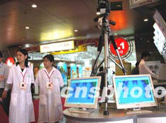 為預(yù)防“非典型肺炎”,二十五日開館的廣交會(huì)二期在展館內(nèi)外設(shè)置眾多“紅外測(cè)溫儀”預(yù)防“非典”。作者:柯小軍