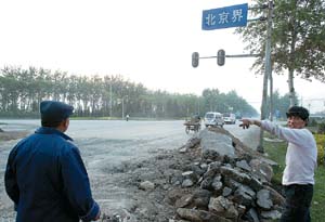 記者停車觀察,路旁的水泥柱上掛著一塊“北京界”的牌子,這里是北京市和河北省香河縣交界的地方。