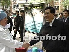 官方消息說,5月1日,胡錦濤和隨行的中共中央政治局委員、國(guó)務(wù)院副總理兼衛(wèi)生部部長(zhǎng)吳儀等在天津檢查防治非典型肺炎工作的落實(shí)情況,親切慰問為防治疫病辛勤工作的廣大干部群眾、醫(yī)務(wù)工作者和科研人員。