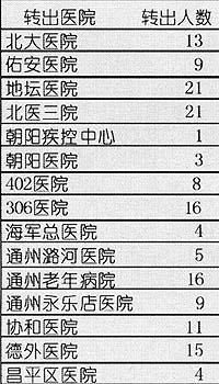 北京非典醫(yī)療指揮中心提供的數(shù)字顯示,轉(zhuǎn)出醫(yī)院和轉(zhuǎn)出人數(shù)的分布為(見表)