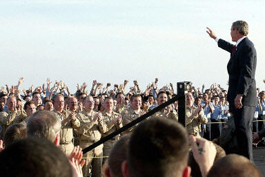 美東部時間5月1日,美國總統(tǒng)布什在從海灣返航的“林肯”號航母上發(fā)表講話,稱伊拉克戰(zhàn)爭的“主要戰(zhàn)斗行動”已經(jīng)結(jié)束,聯(lián)軍在戰(zhàn)斗中取得了勝利。
