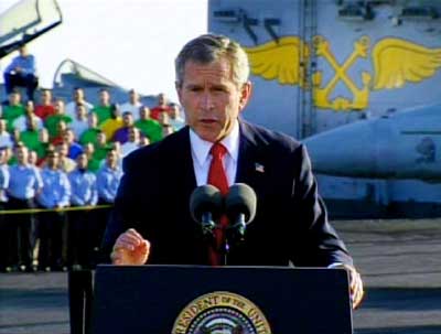 在充滿感情的言辭中,布什不僅僅稱贊推翻薩達(dá)姆政權(quán)的美軍官兵,更是大講特講“9-11”恐怖襲擊,從而將伊拉克戰(zhàn)爭(zhēng)與反恐戰(zhàn)爭(zhēng)融為一體,布什用充滿感情的言辭說:“我們不應(yīng)該忘記9-11遇難的人們,不應(yīng)該忘記遇難者們打的最后一個(gè)電話,不應(yīng)該忘記孩子們慘遭冷酷的謀殺,不應(yīng)該忘記在廢墟中搜尋的日子。因?yàn)檫@些恐怖襲擊,因?yàn)榭植婪肿雍椭С终邆兿蛎绹?guó)宣戰(zhàn),所以他們也得到了戰(zhàn)爭(zhēng)的報(bào)應(yīng)。”布什還用強(qiáng)硬的措辭警告任何“與恐怖組織有關(guān),試圖擁有大規(guī)模殺傷性武器的無法無天的國(guó)家”,它們對(duì)“文明世界形成了嚴(yán)重的威脅,一定會(huì)遭到抵抗的!辈际策@番話顯然是在直接警告伊朗等國(guó)家,并且暗示美國(guó)同樣敢對(duì)它們采取行動(dòng)。