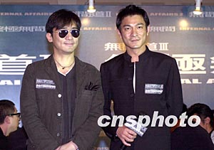 影星梁朝偉、劉德華5月2日在香港出席電影《無(wú)間道Ⅱ》及《無(wú)間道Ⅲ終極無(wú)間》新聞發(fā)布會(huì),兩位影帝將在《無(wú)間道Ⅱ》及《無(wú)間道Ⅲ終極無(wú)間》大斗演技。鄧慶樂(lè) 攝