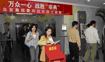 北京奧運(yùn)會(huì)的申辦和籌辦工作,一直得到全國(guó)人民的大力支持。此時(shí)此刻,向戰(zhàn)斗在一線的醫(yī)務(wù)工作者奉獻(xiàn)愛(ài)心,是我們向社會(huì)應(yīng)做的回報(bào)。我們相信,在以胡錦濤同志為總書記的黨中央堅(jiān)強(qiáng)領(lǐng)導(dǎo)下,在廣大醫(yī)務(wù)工作者的辛勤努力下,全國(guó)人民團(tuán)結(jié)一心,眾志成城,我們一定能夠依靠科學(xué)的力量和集體的智慧,打贏非典型肺炎防治工作的攻堅(jiān)戰(zhàn),奪取最后的勝利。