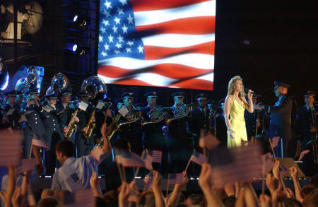 美國空軍預(yù)備軍官樂隊在哥倫比亞公司在2日錄制的特別節(jié)目“搖滾美國——向美軍致敬”中,登上杜魯門號航空母艦與獲葛萊美獎的女歌手席琳狄翁一起表演“天佑美國”。(路透)