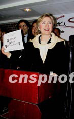紐約州聯(lián)邦參議員希拉里.·克林頓五日到訪紐約華埠,手舉“支持亞洲餐館”的標語,支持華埠商家。中新社記者:趙海燕