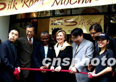 紐約州聯(lián)邦參議員希拉里.·克林頓五日到訪紐約華埠,與社區(qū)人士探討振興華埠議題,澄清“非典”謠言,并按照中國傳統(tǒng)方式為新張的“絲路”咖啡屋剪彩。(希拉里的右邊為咖啡屋老板蔡政存)中新社記者:趙海燕