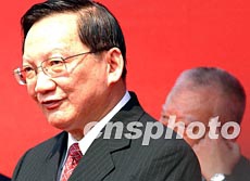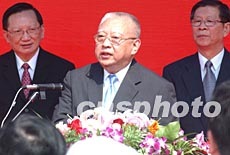 國務(wù)委員唐家璇,五月八日在深圳皇崗口岸舉行的中央政府支援香港抗炎醫(yī)用物品交接儀式上發(fā)表講話。中新社記者 錢興強(qiáng) 攝