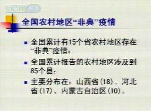但是在這個關(guān)鍵時刻,我們絕對不能放松警惕,不能麻痹大意,我們要防治病情的反彈。特別是是我們要注意到疫情在新的情況底下蔓延,所以我要講一下第二個問題,我們要禁止疫情向農(nóng)村擴散,我們現(xiàn)在先看這個數(shù)字,現(xiàn)在全國已經(jīng)有15個省,農(nóng)村地區(qū)存在了非典疫情,已經(jīng)有85個縣分布在山西省河北省和內(nèi)蒙古自治區(qū)。這個比例比較高。另外,確診病例中,農(nóng)民占的比例雖然不高,只有6%左右,但是我們看到從5月1號開始,這個比例是持續(xù)上升的,到5月11號已經(jīng)達到了6.2%,從這個數(shù)字我們可以看到,在農(nóng)民和農(nóng)村的疫情雖然比較輕,但是有上升的趨勢,我們一定要密切注意這個疫情向農(nóng)村蔓延的趨勢。