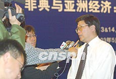 博鰲亞洲論壇《SARS與亞洲經(jīng)濟(jì)的影響評估與政策建議研討會》五月十三日開始在北京舉行,圖為出席會議的亞洲開發(fā)銀行北京辦事處首席經(jīng)濟(jì)學(xué)家湯敏接受記者訪問。