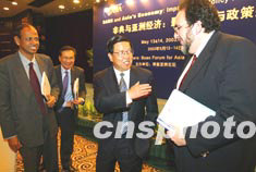 博鰲亞洲論壇SARS與亞洲經(jīng)濟(jì)--影響評(píng)估與政策建議研討會(huì)十四日在北京結(jié)束,博鰲亞洲論壇秘書長(zhǎng)龍永圖(右二)與出席會(huì)議的華爾街日?qǐng)?bào)中國(guó)社長(zhǎng)高賦文(右一)、馬來(lái)西亞駐華大使馬吉德等交談。中新社記者:毛建軍