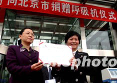 十五日,中國航天科工集團(tuán)公司向北京市政府捐贈五臺抗“非典”治療呼吸機(jī),用于北京的抗非典工作。圖為中國航天科工集團(tuán)公司副總經(jīng)理薛利(右)與北京市民政部門代表在捐贈儀式上。中新社記者:武仲林