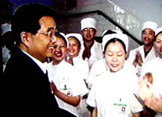 上午10時(shí),胡錦濤總書記來到四川省人民醫(yī)院看望醫(yī)務(wù)人員和病員,并在這里親自主持了醫(yī)務(wù)界及有關(guān)方面代表參加的防治非典座談會(huì)。