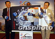 香港推出“吃喝玩樂Come Back Hong Kong”運(yùn)動(dòng)!俺院韧鏄稢ome Back Hong Kong”運(yùn)動(dòng)五月十九日在香港展開,其旨在鼓勵(lì)香港市民拋開對(duì)非典型肺炎疫情的憂慮,重新投入積極的生活。圖為香港總商會(huì)總裁翁以登(左)、香港餐飲聯(lián)業(yè)協(xié)會(huì)會(huì)長(zhǎng)伍德良(右)等擊打“SARS病毒”從而為該活動(dòng)揭幕。中新社記者:潘索菲