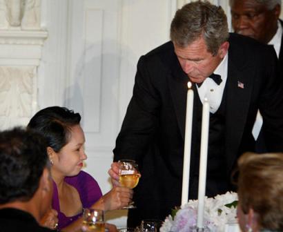 聽完布什總統(tǒng)的祝酒詞,阿羅約總統(tǒng)一飲而盡,并發(fā)表了她自己的祝酒詞,呼吁“進(jìn)一步擴(kuò)大這一正義的伙伴關(guān)系以完成志愿聯(lián)盟的更大任務(wù)!
