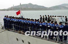 5月20日上午10時,中國海軍艦艇部隊統(tǒng)一鳴笛一分鐘并下半旗,向在執(zhí)行訓(xùn)練任務(wù)中失事的361潛艇70名遇難官兵致哀。圖為沉浸在悲痛之中的導(dǎo)彈護衛(wèi)艦官兵正在下半旗,寄托對遇難戰(zhàn)友的哀思。作者:張全躍