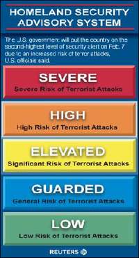 中新網(wǎng)5月21日電 美國(guó)國(guó)土安全部20日宣布,將全國(guó)安全警戒級(jí)別從五級(jí)彩色預(yù)警系統(tǒng)中的中間級(jí)別黃色提高到次高級(jí)別橙色。