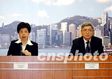 香港衛(wèi)生署長(zhǎng)陳馮富珍及醫(yī)院管理局行政經(jīng)理劉少懷,5月22日在記者會(huì)公布新增3宗SARS個(gè)案,當(dāng)中沒(méi)有醫(yī)護(hù)人員,再有3名女病人死亡。另外有10名康復(fù)者出院,香港至今已連續(xù)7天錄得少于5個(gè)SARS感染病例。洪少葵 攝