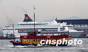 世界衛(wèi)生組織5月23日起解除對(duì)香港和廣東省維持個(gè)多月的旅游警告,稱兩地已有效控制SARS疫情。消息無疑是香港重振經(jīng)濟(jì)的強(qiáng)心針。圖為穿梭在維多利亞港灣的海上郵輪和仿古游船將迎接游客重臨香江。洪少葵 攝