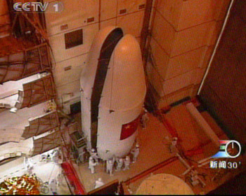 衛(wèi)星發(fā)射前,科研人員進(jìn)行衛(wèi)星與火箭的總裝。(以上均為CCTV圖)