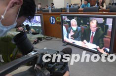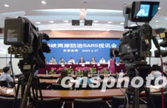 五月二十七日上午九時(shí),海峽兩岸防治SARS視訊會(huì)在北京、臺(tái)北、廣州、香港四地同時(shí)舉行。近五十名與會(huì)專家就SARS病人的臨床診斷、流行病特征、治療方法等問題交換了意見。中新社記者:張煒