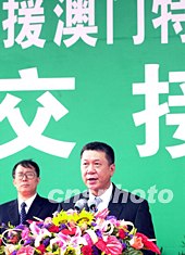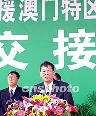 中央政府支援澳門抗擊非典型肺炎醫(yī)用物品交接儀式二十七日在拱北口岸舉行,全國政協(xié)副主席、港澳辦主任廖暉,澳門特區(qū)行政長官何厚鏵、中央駐澳聯(lián)絡(luò)辦主任白志健等出席儀式。中新社記者:李剛