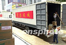 中央政府支援澳門抗擊非典型肺炎的醫(yī)用物品,二十七日運(yùn)抵設(shè)在澳門旅游中心的“抗非典應(yīng)變小組總指揮部”。中新社記者:李剛