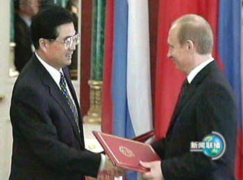 今天是胡錦濤主席訪俄的第二天。當(dāng)?shù)貢r(shí)間今天上午,胡錦濤主席向無(wú)名烈士墓敬獻(xiàn)了花圈,并參觀了俯首山衛(wèi)國(guó)戰(zhàn)爭(zhēng)博物館。中午,普京總統(tǒng)在克里姆林宮為胡錦濤主席舉行了歡迎儀式并進(jìn)行小、大范圍會(huì)談。會(huì)談結(jié)束后,兩國(guó)元首簽署了中俄聯(lián)合聲明等三個(gè)文件。